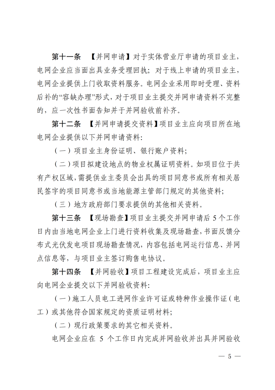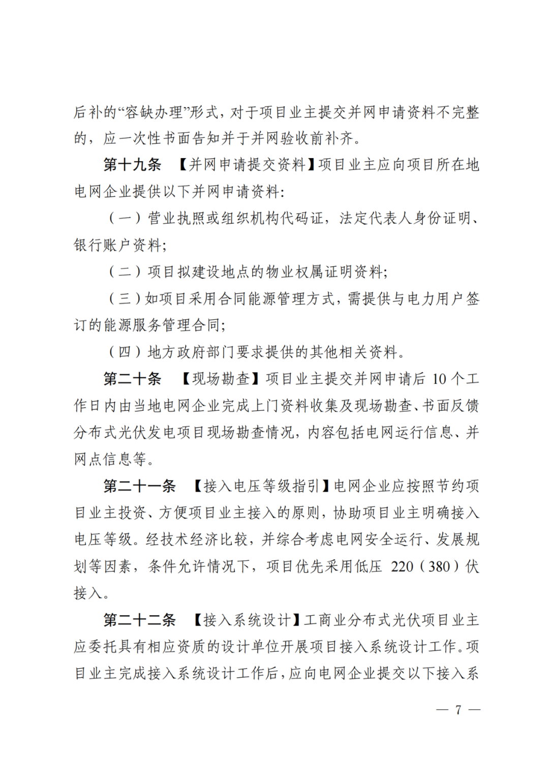 项目主要包括业主自建的户用自然人分布式光伏项目和就地开发、就近利用且单点并网容量小于6兆瓦的户用光伏以外的各类分布式光伏发电项目。文件从项目合规性、备案指引、运营模式、接入电压、并网流程等方面进行了规定。本指引自印发之日起试行,有效期2年,内容详细,对全国其他地区具有参考意义。
